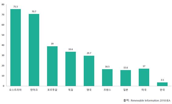 우리나라는 OECD 국가들 중, 발전량에서 재생에너지가 차지하는 비율이 가장 낮은 국가이다.