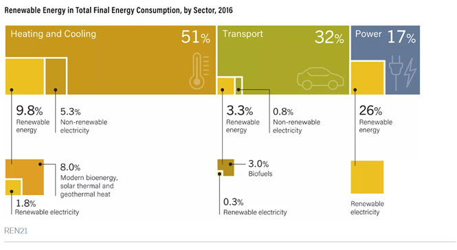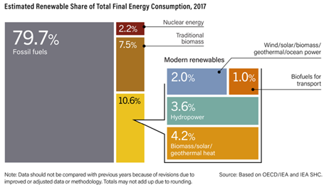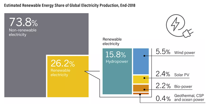 ▶ 2018년 REN 21이 추정한 재생에너지 전기는 최종에너지에서 재생에너지 비중보다 높은 26.2%이며 수력발전을 제외했을 경우에도 10.5%임.