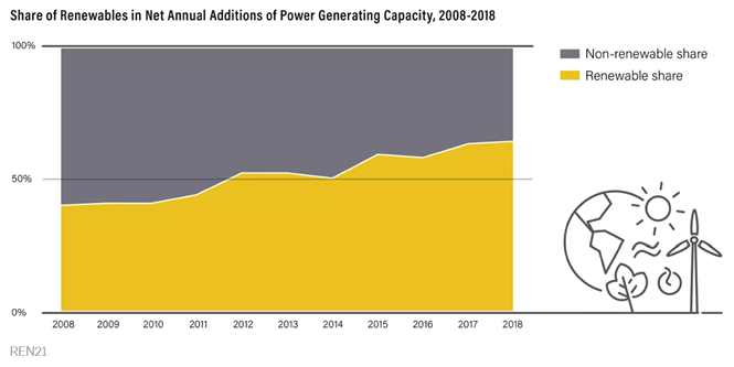 ▶ 발전설비로는 비재생에너지 비중을 앞질렀으며 태양광 발전설비는 한 해에 100기가와트 분량이 늘어나고 있음.