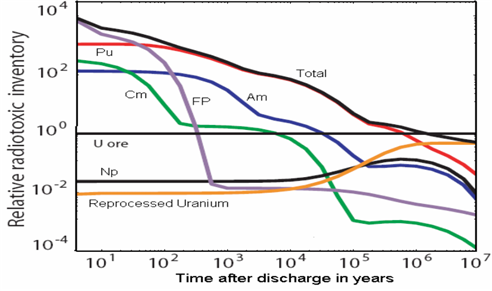 ▶ 사용후핵연료의 방사선량을 줄이기 위해 재처리 기술이 개발되긴 했지만 플루토늄 추출에 의한 핵무기 확산 위험과 재처리 과정에서 방사능오염으로 더 많은 핵폐기물이 발생하므로 장기간 생태계와 격리해서 안전하게 보관하면서 방사선량이 줄어들기를 기다리는 방법이 현재로서는 최선임.