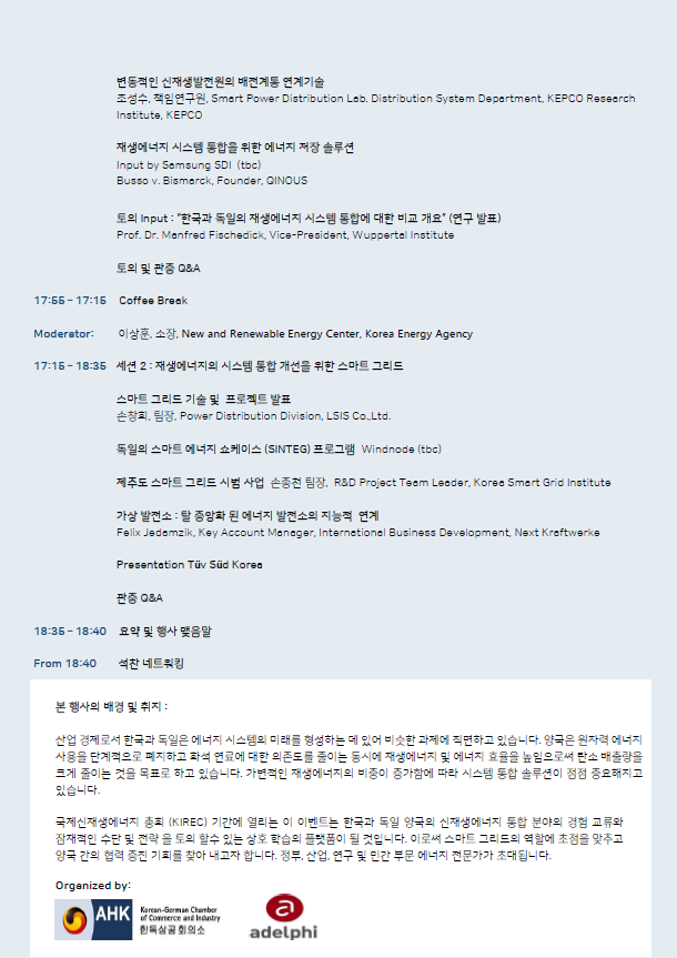 [외부행사] 제2차 한-독 에너지의 날 : 스마트그리드를 통한 신재생에너지의 계통 연결 작성자: desk - 2019.10.18 로그인 또는 회원등록 댓글을 쓰려면 221 views / 0 Comments 일시 : 2019년 10월 24일 목요일 장소 : 코엑스 인터콘티넨탈 호텔, 비바체룸 언어 : 한국어 - 영어(동시 통역 제공) 독일 재생에너지스스템통합 에너지저장 배전계통연계끼술 배전계통 독일의 재생에너지 시스템 스마트그리드 가상발전소 에너지정책 재생에너지시스템통합 송전그리드운영 주한독일대사 한독상공회의ㅅ