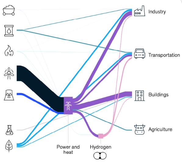 재생에너지로의 전환과 연료의 전기화를 통해 탄소 감축을 가장 많이 달성할 수 있습니다. 이는 전체 감축분의 44%를 차지하는 것으로 보고된 만큼 그 효과가 매우 클 것으로 예상됩니다. 재생에너지로의 전환과 전기화는 사실상 함께 가는 것인데, 이는 태양광, 풍력 등의 재생가능한 자원을 통한 에너지의 생산은 전력의 생산을 의미하기 때문입니다. 그렇기 때문에 전기화 역시 우리가 달성해야할 목표 중 하나라고 볼 수 있습니다. 전체 탄소 감축분의 13%로 그 효과가 두 번째로 큰 것으로 나타난 수소 역시 재생에너지의 가격이 저렴해짐에 따라 잠재력이 높아졌음을 확인할 수 있었습니다.