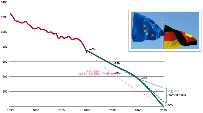 여태까지 독일의 온실가스 감축 경로 및 앞으로의 목표치를 보면 마지막 10년, 즉 2040년부터 2050년까지의 기간 동안 많은 감축이 이루어져야 함을 확인할 수 있습니다. 또한, 유럽연합이 2030년까지 감축 목표를 65%로 상향 조정할 것임을 발표함에 따라 독일의 정책도 영향을 받게 될 것입니다. 이러한 상황을 미루어 보았을 때 독일은 감축을 위해 현재보다도 많은 노력을 들여야 할 것으로 보입니다.