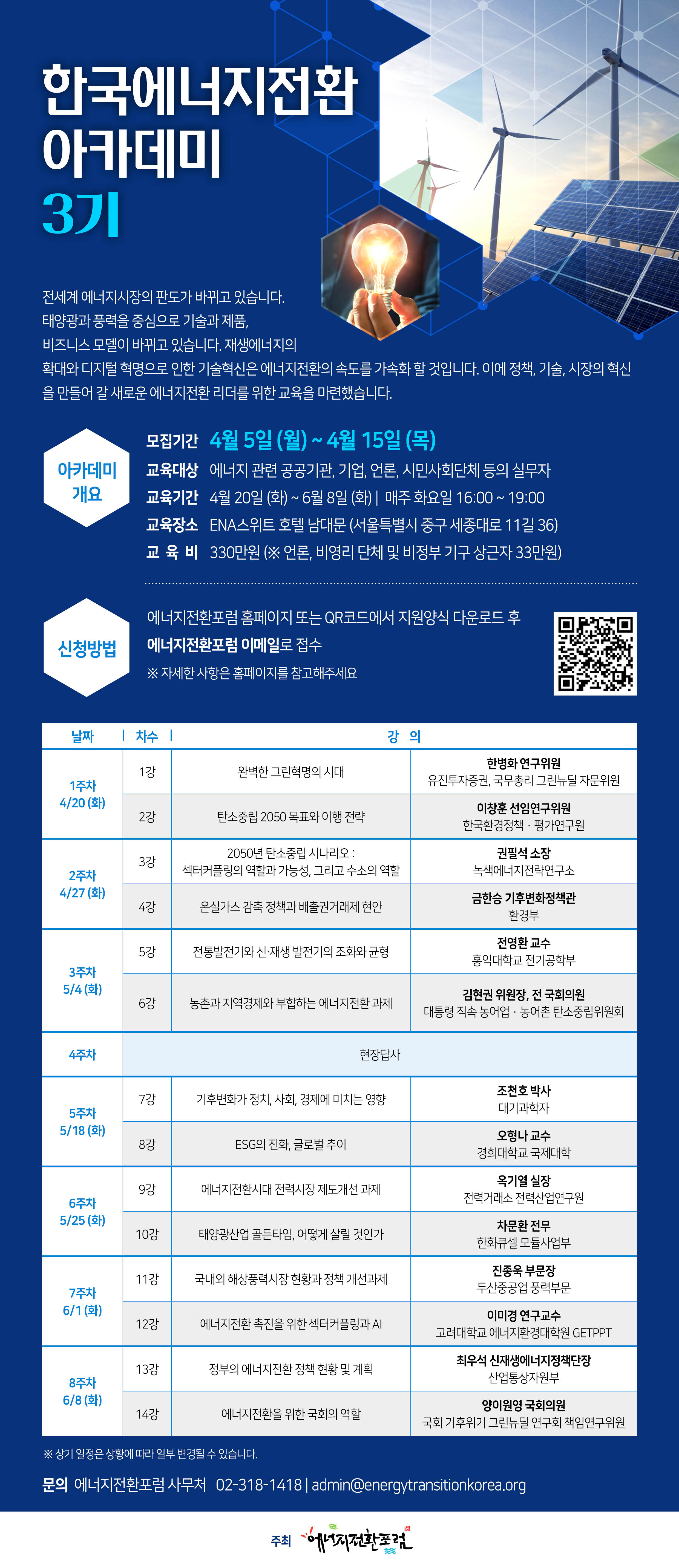 그러나 원자력과 석탄화력과 같은 전통에너지에 대한 의존도가 높은 우리나라는 에너지전환의 속도가 더디며, 새로운 시대를 대비한 기술개발과 시장혁신도 어려운 상황입니다. 이에 정책, 기술, 시장 등 다양한 영역에서 혁신을 일구며 에너지전환 시대를 열어 갈 새로운 에너지전환 실무자를 위한 교육을 마련했습니다.