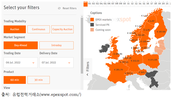 그림 1. 유럽의 도매전력시장 가격(€/MWh, 7월6일 거래기준)