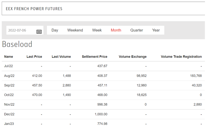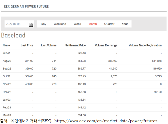 또한 선물시장 역시 프랑스의 경우 올해 12월 선물가격이 무려 1,000€/MWh(1,370원/kWh)으로 인근 가동원전이 3기밖에 없는 독일의 455€/MWh의 두배가 넘는 수준이다 (그림 2, 그림 3 참고).