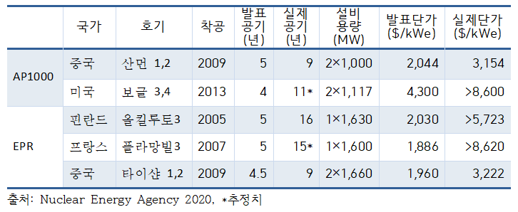 실제로 유럽과 미국 전력시장에서 신규원전은 후쿠시마 사고 이후 한층 강화된 안전규제와 이로 인한 만성적인 건설공기지연, 치솟는 건설비용으로 인해 투자 불확실성이 여전히 크게 남아있다. 최근 준공되었거나 건설중인 대표적인 유럽의 원전들은 핀란드 올킬루토-3, 프랑스 플라망빌-3호기다. 이들 대부분은 건설공기가 15년에 육박하며, 건설비용은 애초보다 두 배를 넘고 있다 (표 1 참고).