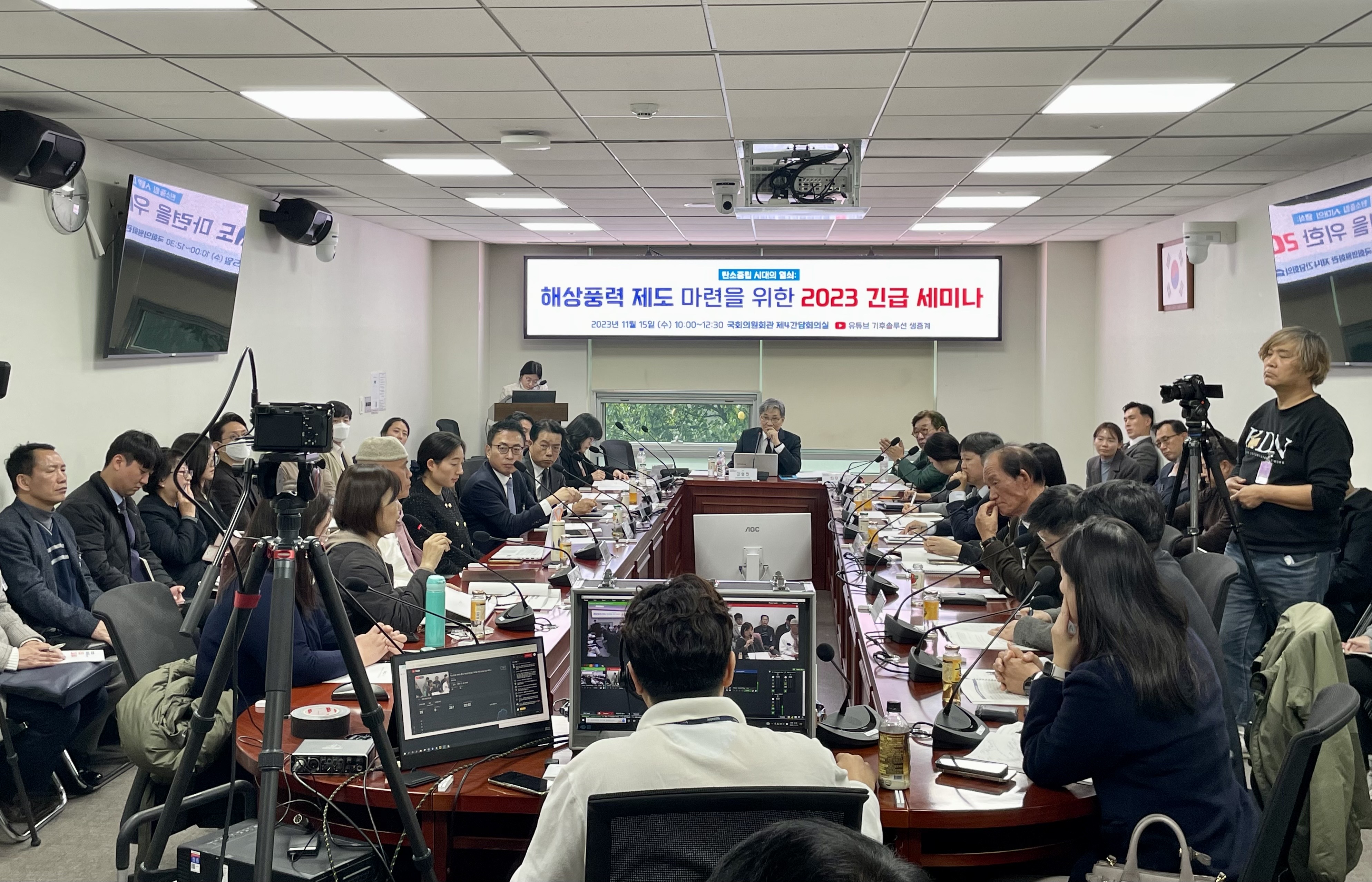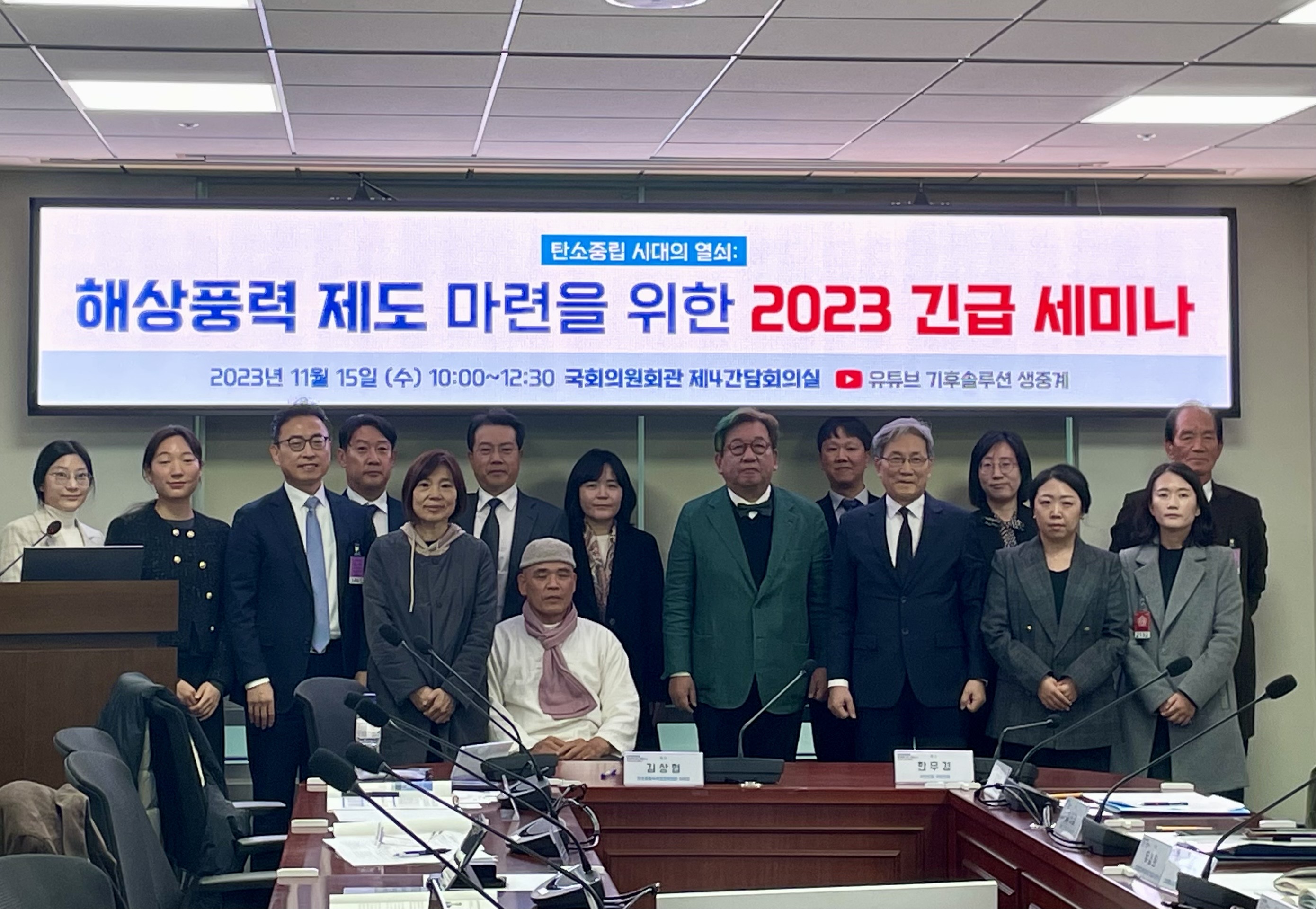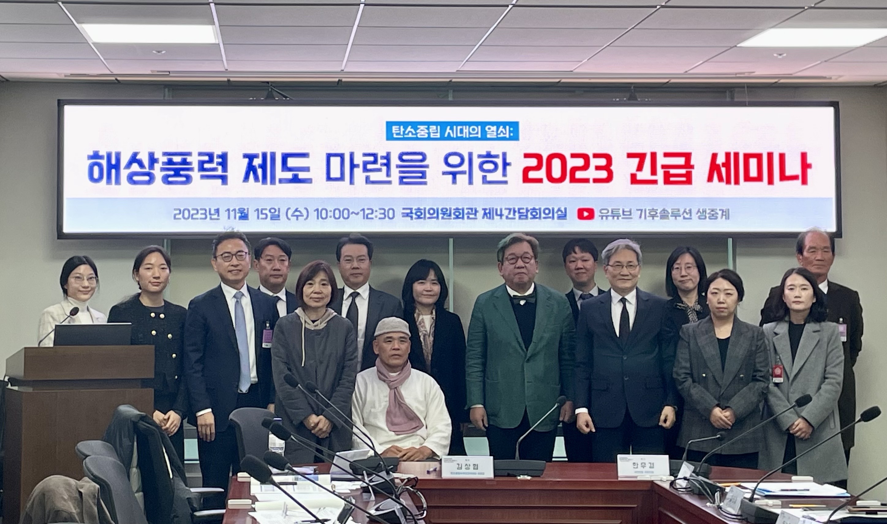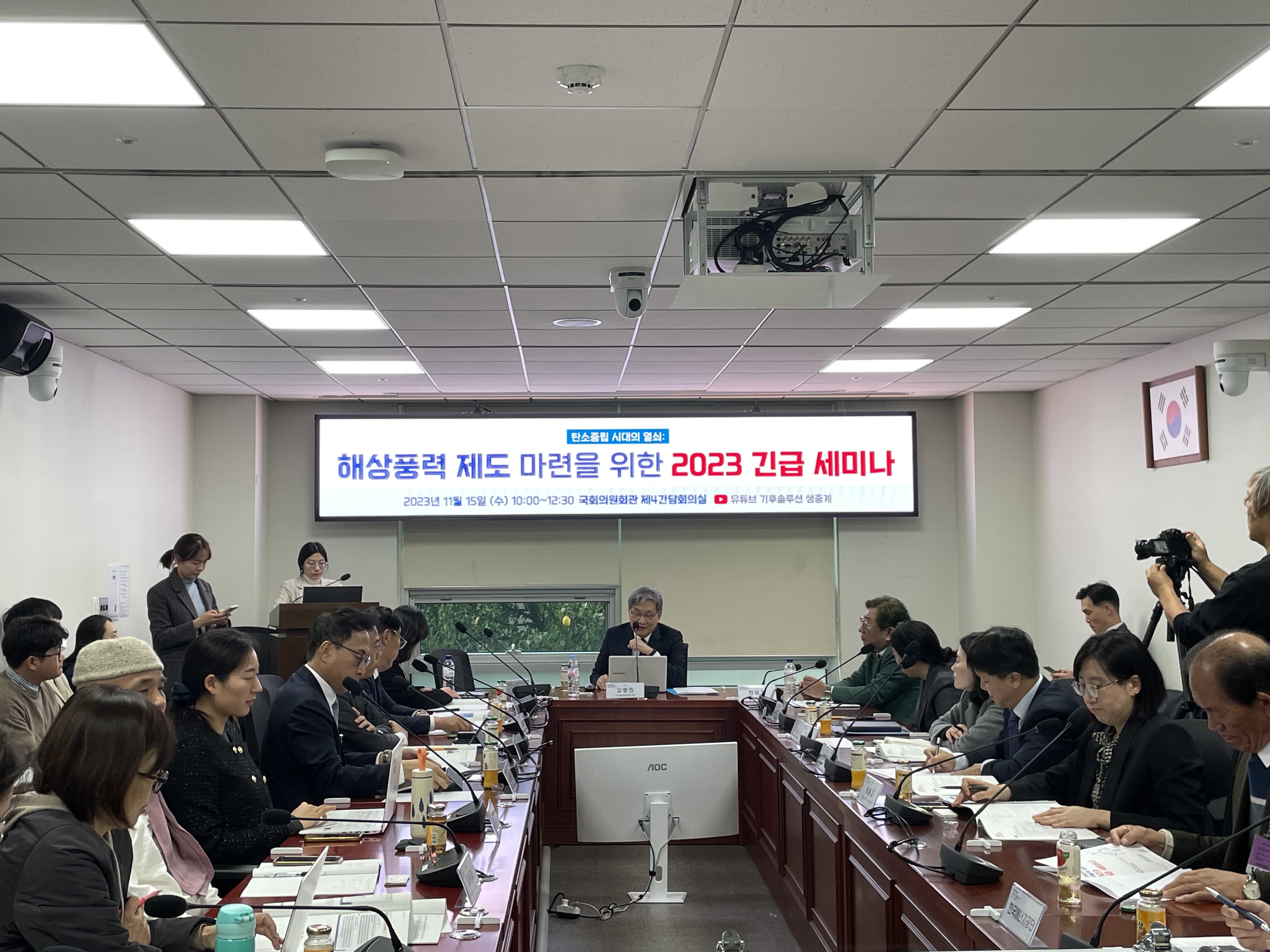 이해당사자들이 해상풍력 논의를 재개해 질서 있는 해상풍력 보급을 이루기 위한 국회 긴급 세미나가 열렸다. 15일 국회의원회관 제4간담회의실에서 김정호 의원(국회 기후위기특별위원장), 김한정 의원, 한무경 의원이 주관하고 기후솔루션, 에너지전환포럼, 환경운동연합, 기후위기대응 에너지전환 지방정부협의회가 주최하는 ‘해상풍력 제도 마련을 위한 2023 긴급 세미나’가 열렸다.