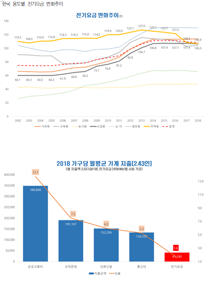 현 정부가 에너지전환정책 추진 중임에도 석탄화력발전소와 원자력발전소는 여전히 건설 중이고 더 증가하고 있다. 95%의 에너지를 수입하는 우리나라는 전기요금은 낮고 1인당 전기소비는 주요 선진국에 비해 월등히 높다. 전기소비 비중이 높은 산업용 전기소비가 많아서인데, 산업용 전기소비를 줄이는 대신 주택용 전기소비를 늘리는 정책은 바람직하지 않다.